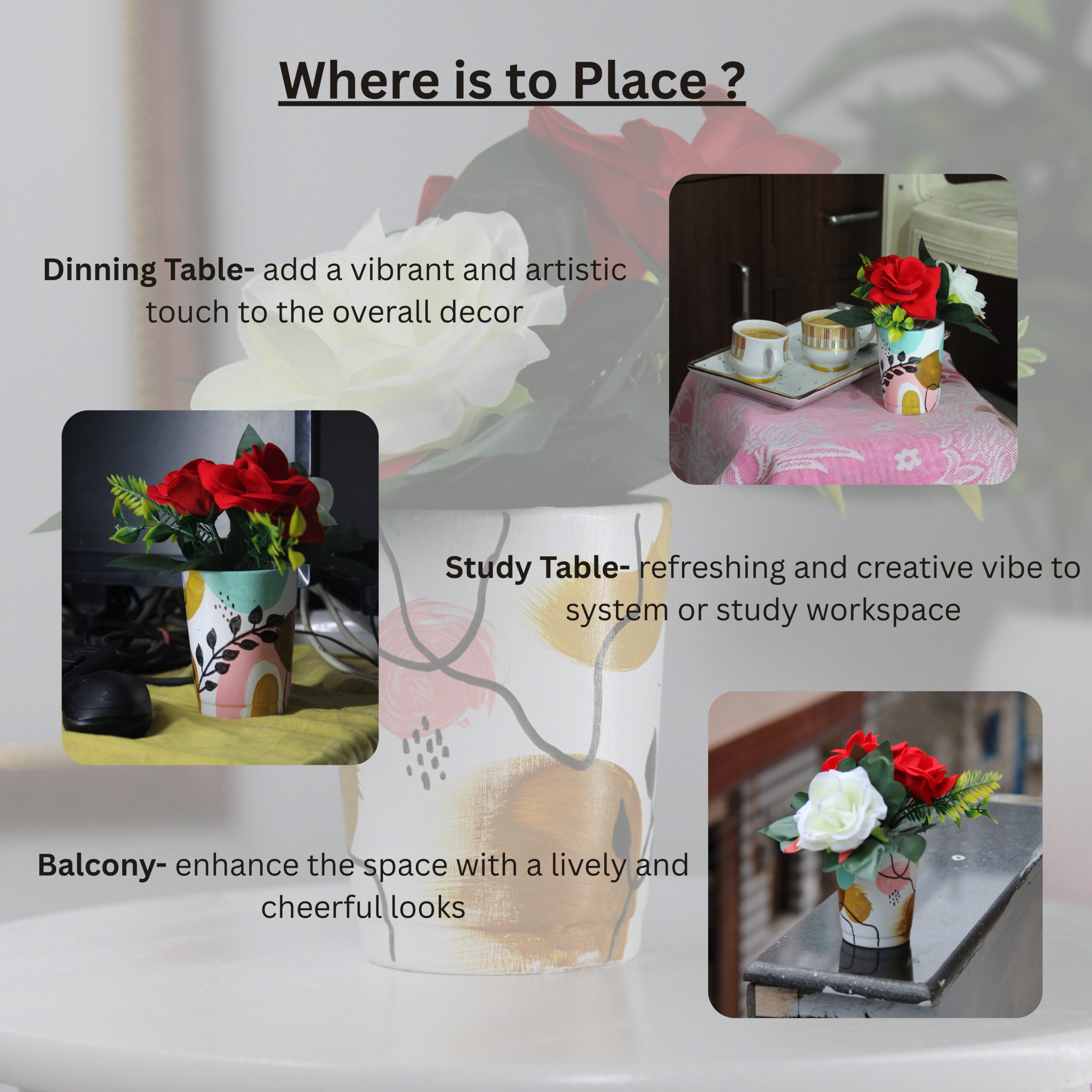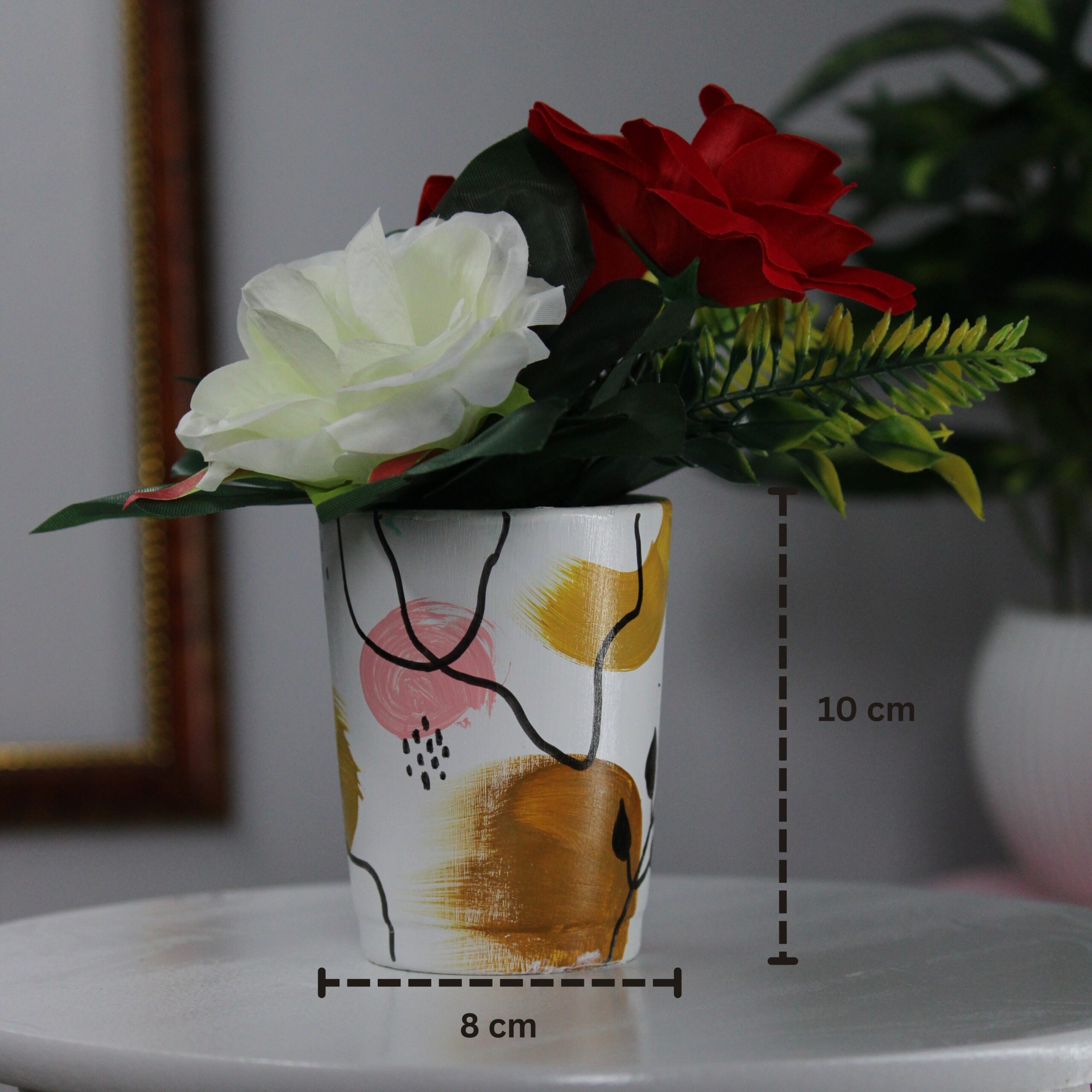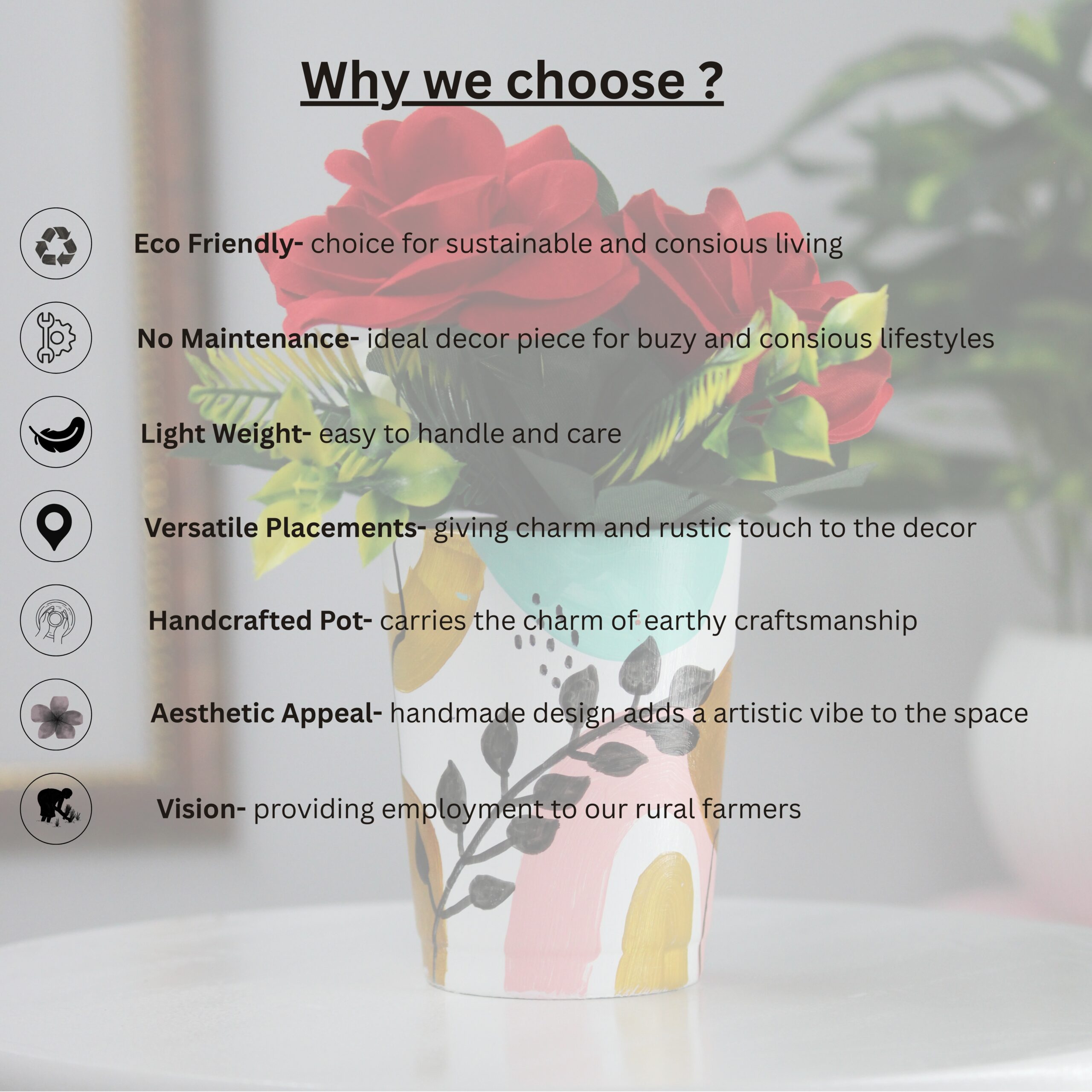 Beautiful handmade clay pots with lifelike rose artificial flowers. This set of 2 adds a natural and elegant touch to any corner of your home decor