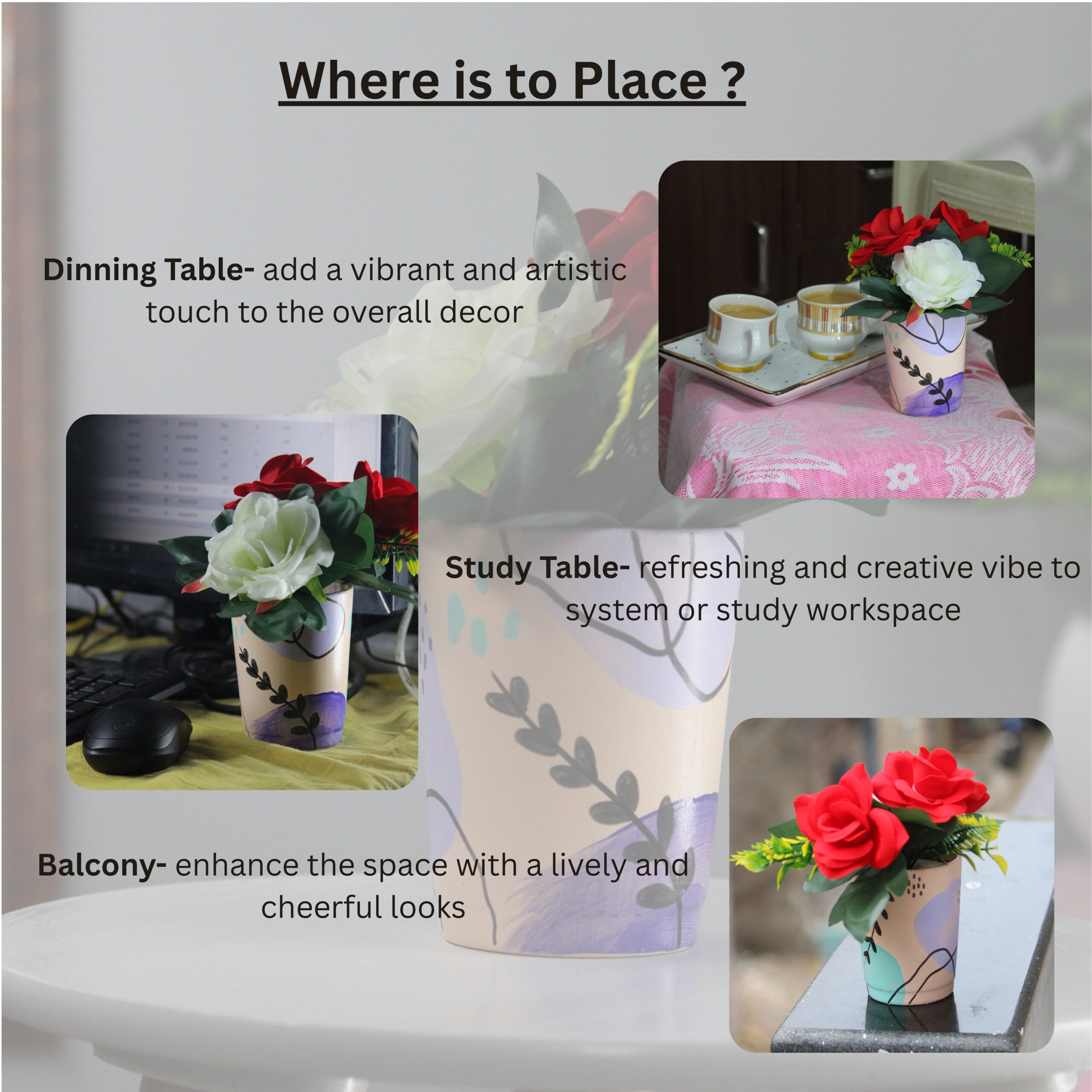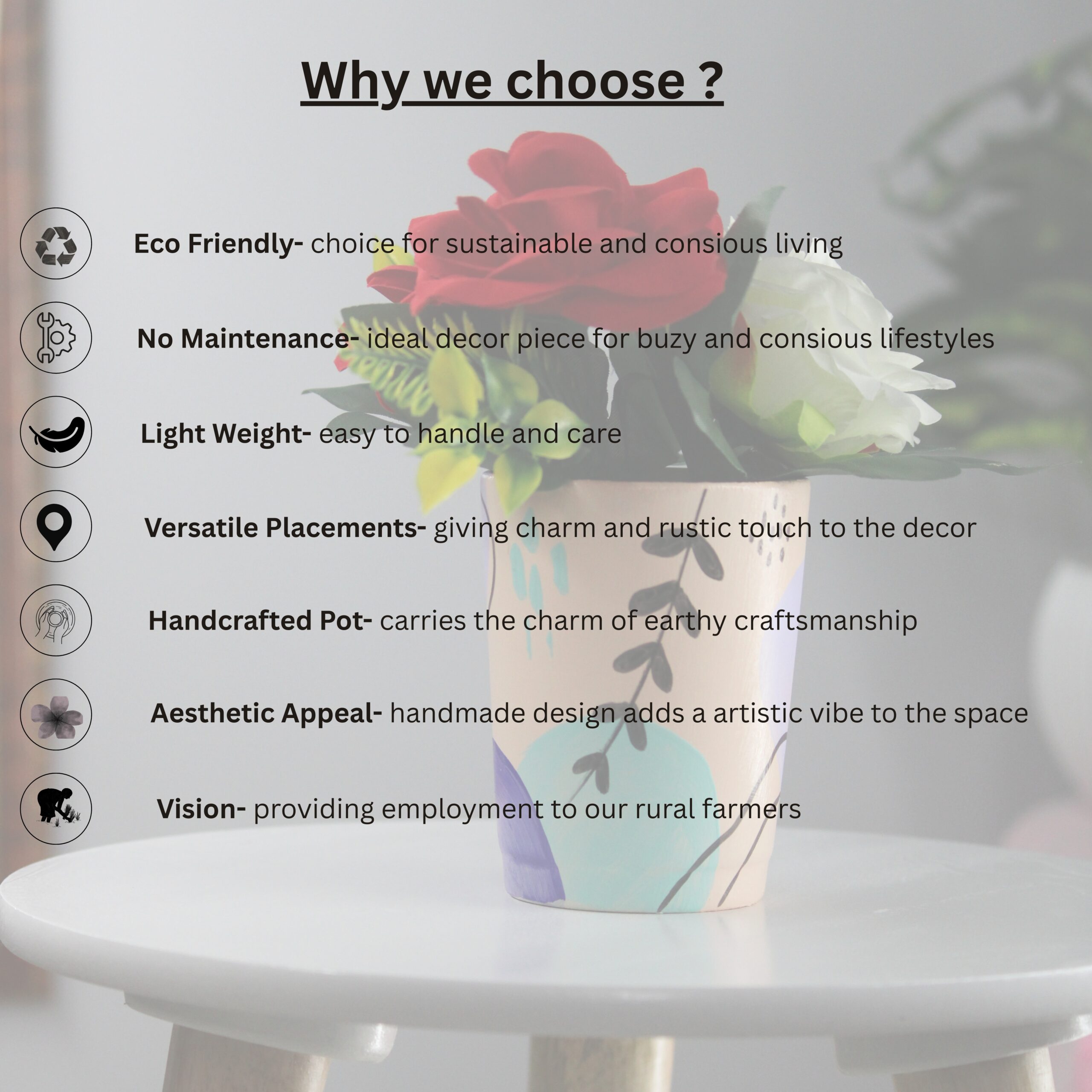 Beautiful handmade clay pots with lifelike rose artificial flowers. This set of 2 adds a natural and elegant touch to any corner of your home decor
